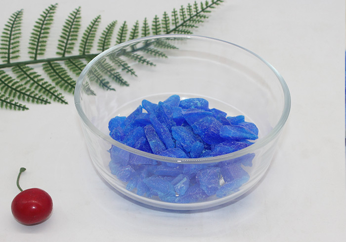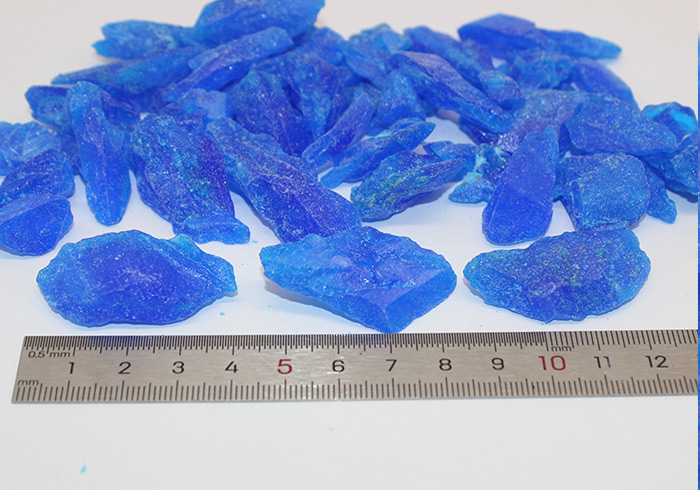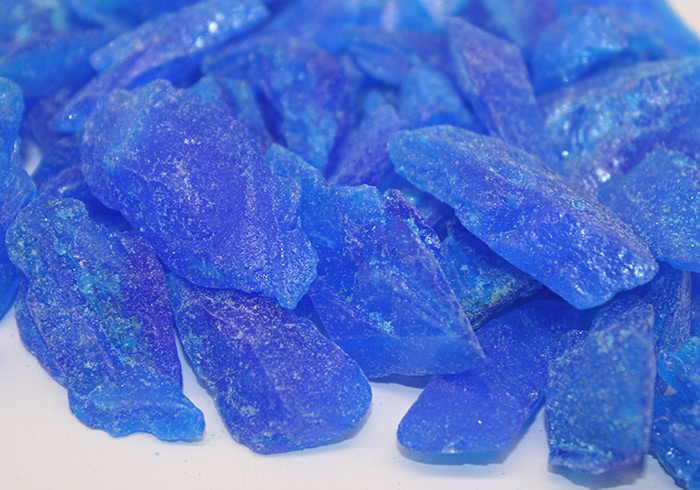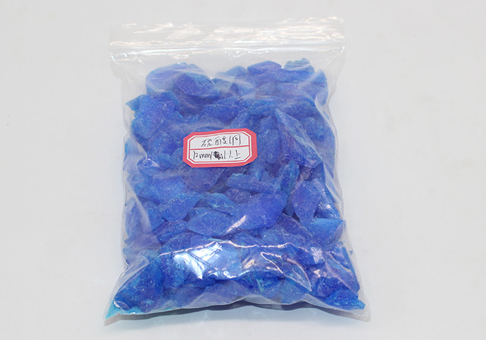 天然或人工制造的含水硫酸銅結(jié)晶體。形狀為不規(guī)則的塊狀結(jié)晶體,大小不一,深藍(lán)色或淡藍(lán)色,半透明。置露于干燥空氣中,緩緩風(fēng)化。加熱燒之,即失去結(jié)晶水變成白色,遇水則又變藍(lán)。質(zhì)脆,易碎,能溶于水。無(wú)臭,帶金屬色味,味苦、澀,有毒。