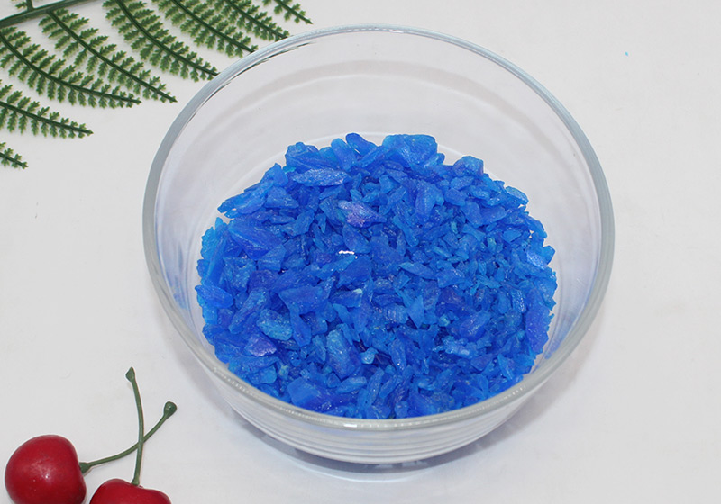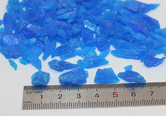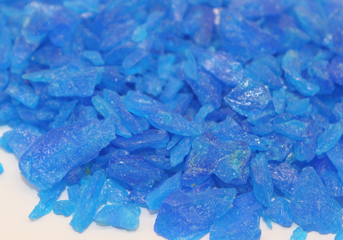 天然或人工制造的含水硫酸銅結(jié)晶體。形狀為不規(guī)則的塊狀結(jié)晶體,大小不一,深藍(lán)色或淡藍(lán)色,半透明。置露于干燥空氣中,緩緩風(fēng)化。加熱燒之,即失去結(jié)晶水變成白色,遇水則又變藍(lán)。質(zhì)脆,易碎,能溶于水。